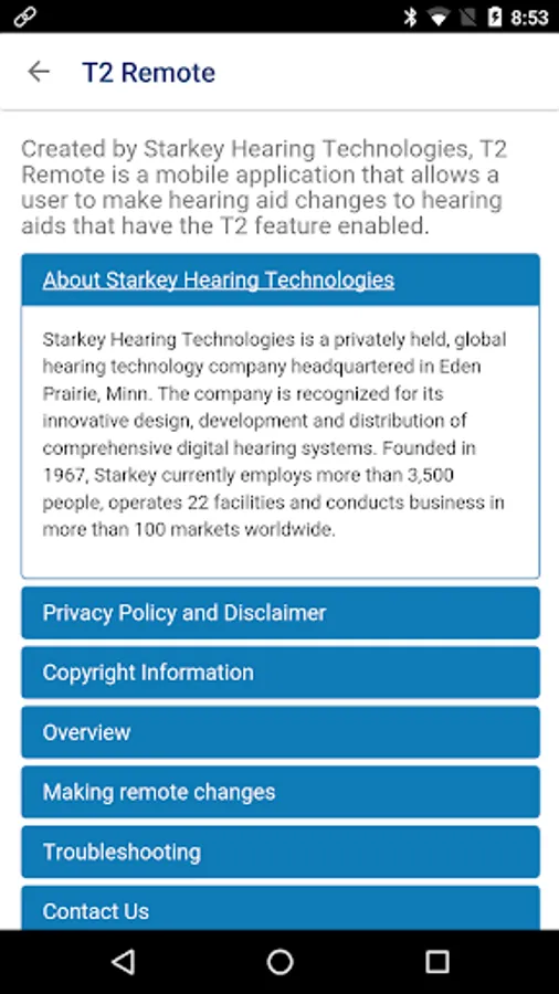The T2 Remote application takes advantage of a breakthrough technology from Starkey Hearing Technologies that allows users to control their hearing aids with a simple touch on their phone. This avoids the need for any additional hardware. T2 in the hearing aids will discreetly and instantly classify the tone signal from the phone and automatically adjust itself to the desired setting.