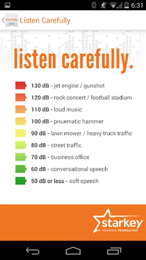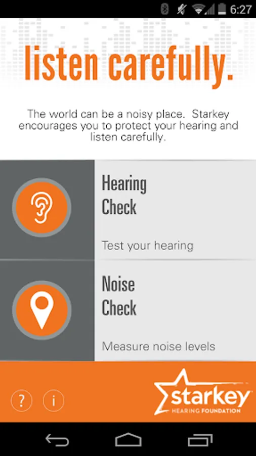 Listen Carefully is a hearing screener / sound level meter application created by Starkey Hearing Technologies that allows you to measure environmental noise levels and to quickly evaluate your own hearing to determine if it is within a normal range, or if you have potential hearing loss.