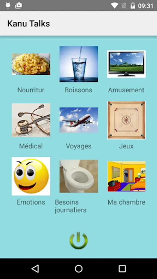 Il a une page d'accueil avec plusieurs boutons pour naviguer d’un écran à un autre. L'autre écran a une plus grande image et le besoin sera prononcé en y cliquant. Le bouton Accueil ramène la personne à l'écran d'accueil.