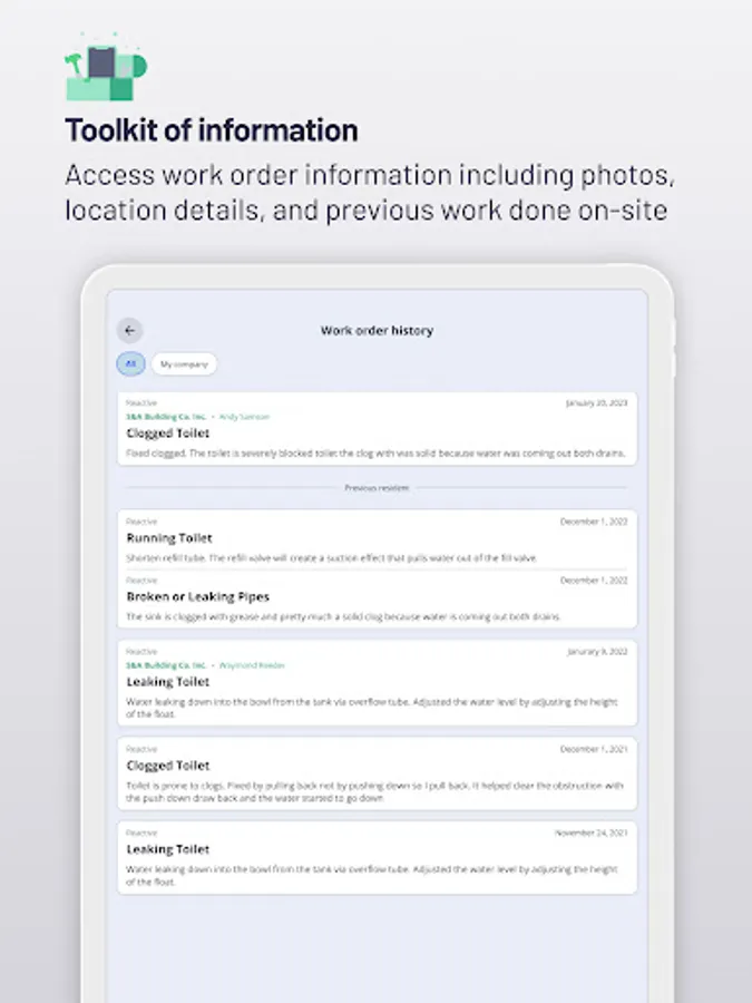 · Informational – One Onsite provides information and photos around the work order, guides the technician to the location that they need to visit and provides relevant historical service information. It also helps the technicians understand what information needs to be provided to their back office based on the trade