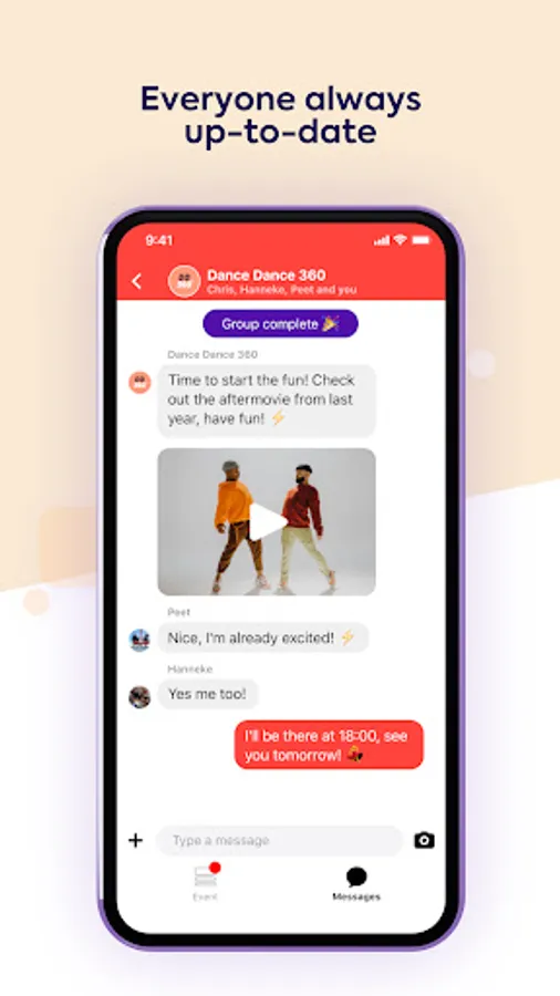 What time do you have to be there? Where to park? Which measures apply? No stress! The app contains all relevant event information in a clear overview. Everyone in the group will receive updates and helpful reminders.