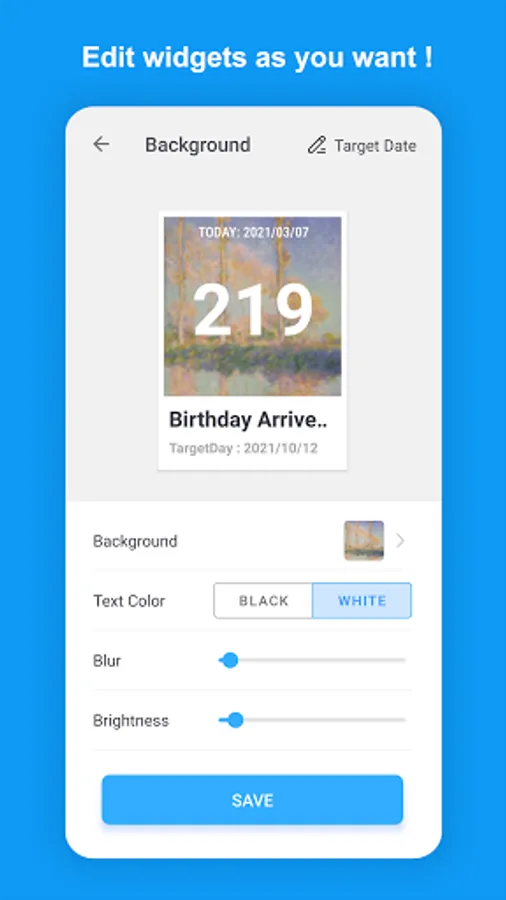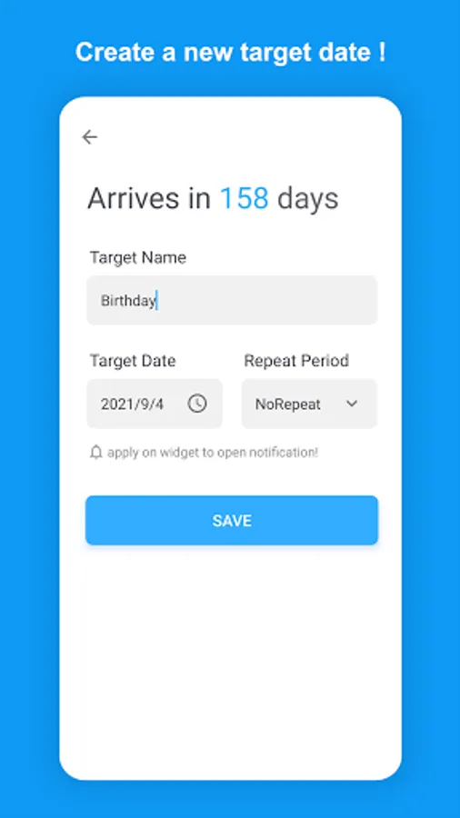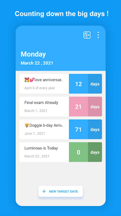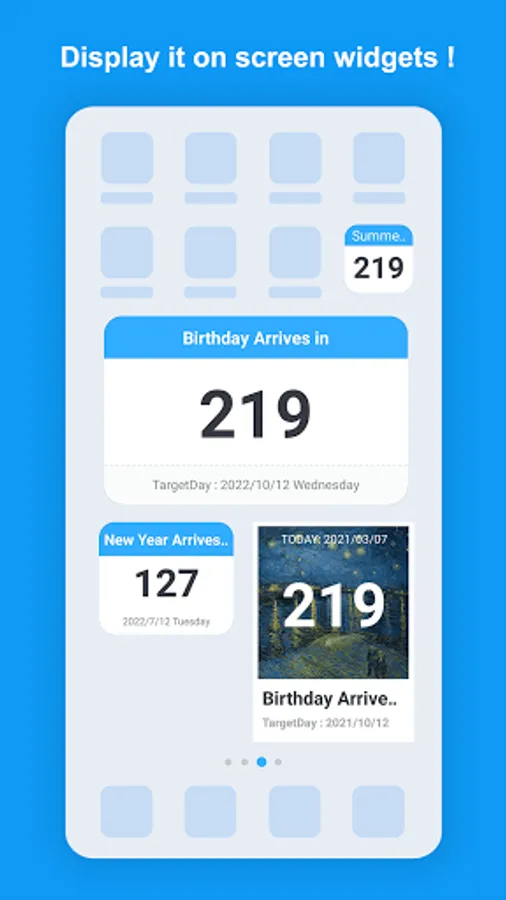 Displays the number of days from the big days on your screen, such as birthday, love anniversary, pay day, so you won't miss the big days!