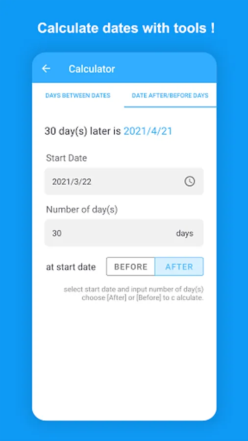 Calculates the number of days between two dates, or calculates another date based on the number of days before or after the date.