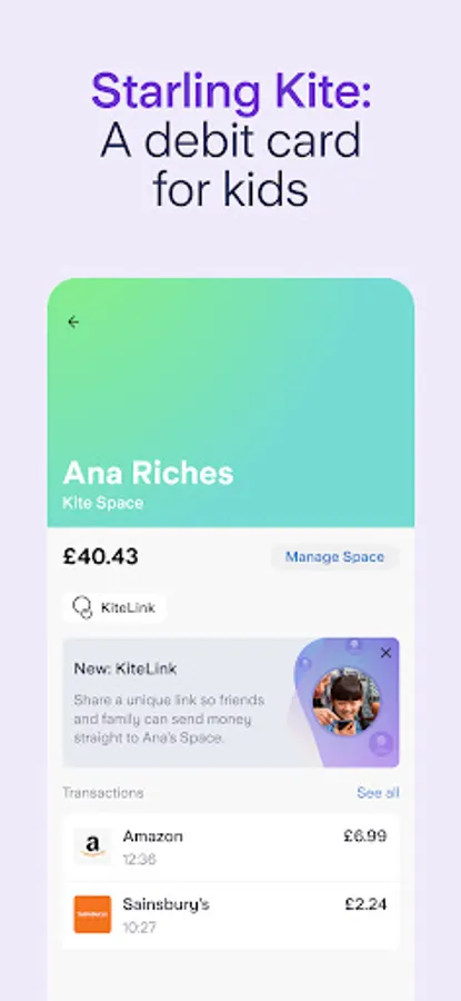 Kite is our debit card and app for kids. It’s like a child bank account, but built seamlessly into your Starling account (personal or joint) for better visibility and control. Kids have their own version of the app, too.