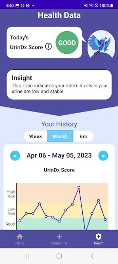 Take urinary tract infections (UTIs), for example. Did you know that some UTIs are caused by bacteria that produce a molecule called nitrites? Well, UrinDx is able to measure changes in the absorption characteristics associated with nitrites at various wavelengths of light as urine flows through the device. Starling then compiles changes in these absorption characteristics and others over time into a holistic score called the UrinDx Score. This score is indicative of changes in various biomarkers of interest like nitrites in your urine, giving you a snapshot of your urinary health.