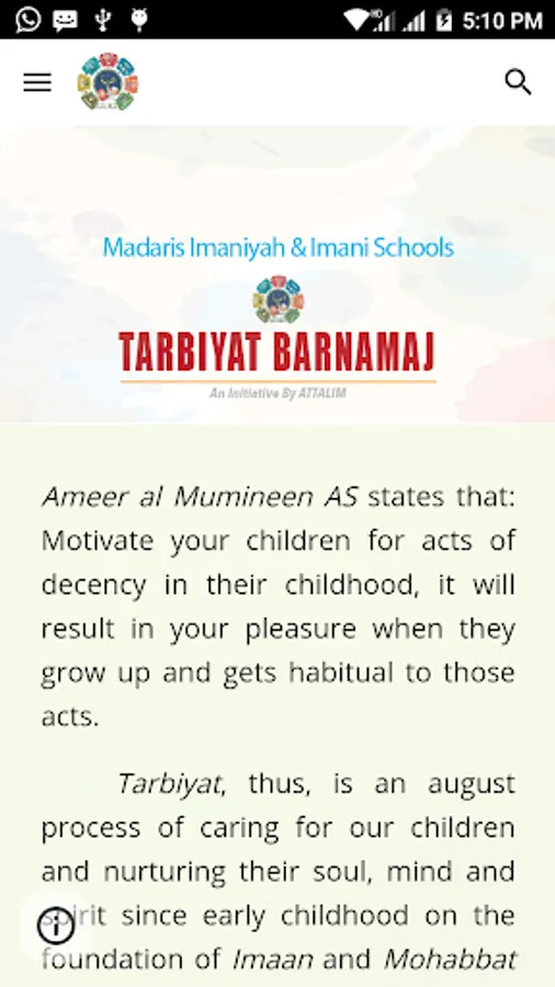 Daerat Al Tarbiyat wa al Ta'leem , with the vision of accentuating the notion of Tarbiyat al Awlaad to the magnitude of institutionalizing it and to standardize all these Tarbiyat pursuits of Imaani Schools and Madaris Imaaniyah into a structured and uniform manner has launched Tarbiyat Barnamaj.