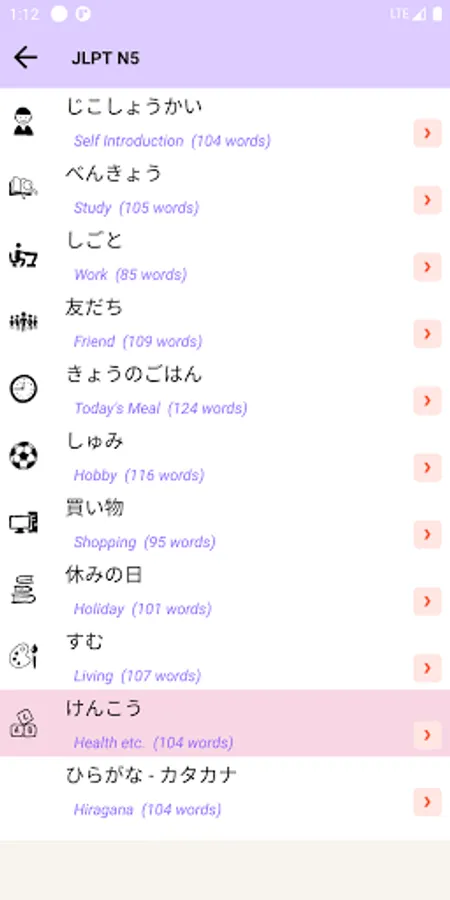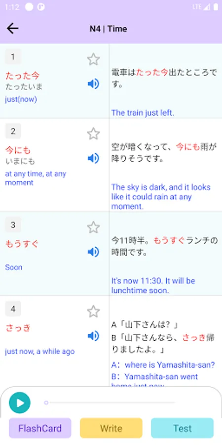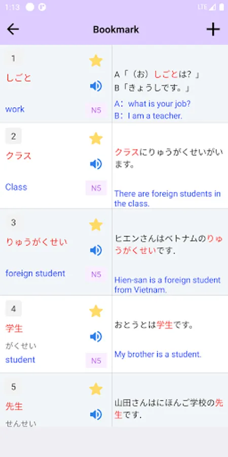 This app provides you with 10000 words ranging from N5 to N1 with various useful features for studying and practicing. Audio files are also supplied along with the word and examples to help users practice listening at the same time, which is very convenient.