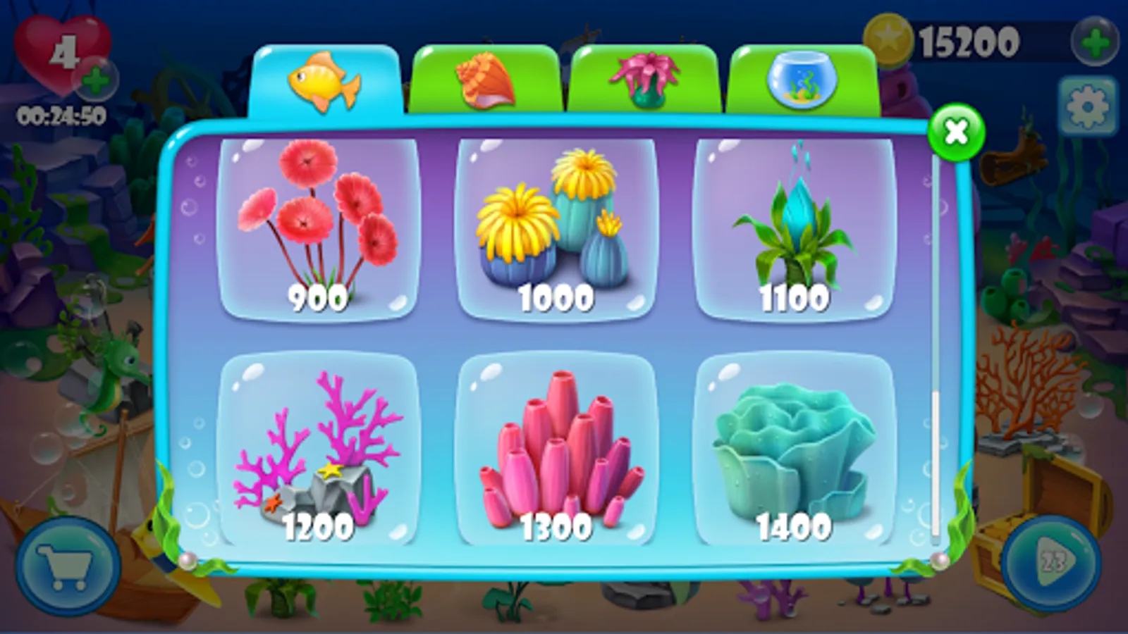 Your task is to develop and decorate the aquarium for points that you can earn by playing "three in a row." The more coins you have, the more beautifully you will be able to decorate your aquarium and fill with different living creatures.
