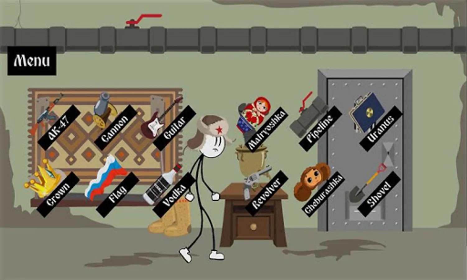 You have to play the character Stickman Henry. Your task is to find two successful ways to escape from a Russian prison with russian diamond. Enjoy!For completing the mission, Tools include Russian-style matryoshka dolls and cartoon headgear of Cheburashka. You wanted the russian diamond. You can repeat the selected action at any time, and the humorous and interesting animation will inspire your spirit. Can you see where is the diamond?