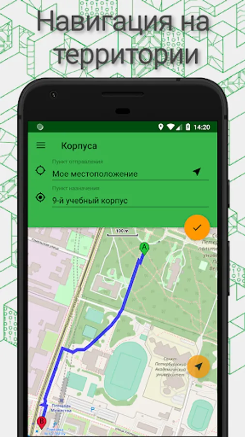 Finding the way between the buildings of the university: the navigator will determine your location on the territory of SPbPU and build the shortest route to the Polytech you specified.