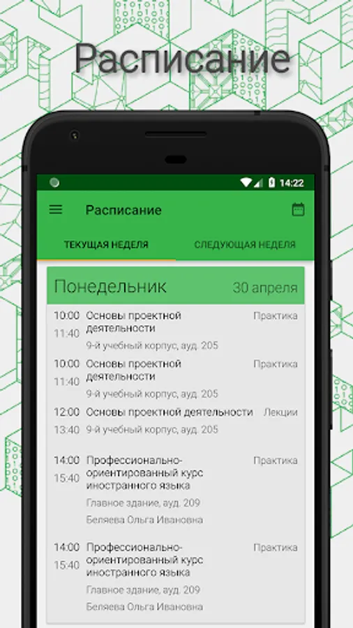 Class schedule: your group schedule is available offline! Student, be aware of upcoming classes at the university and do not be late for classes.