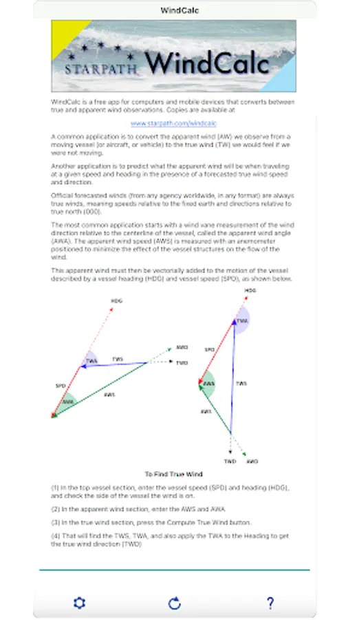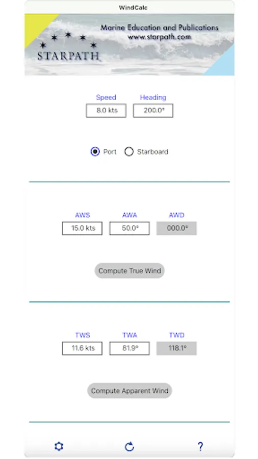 This app converts apparent wind to true wind or ground wind, depending on the inputs for vessel speed and heading. Likewise, from a forecasted true wind and known course and speed it will compute the expected apparent wind. The included help file explains these conversions, needed daily by sailors underway.