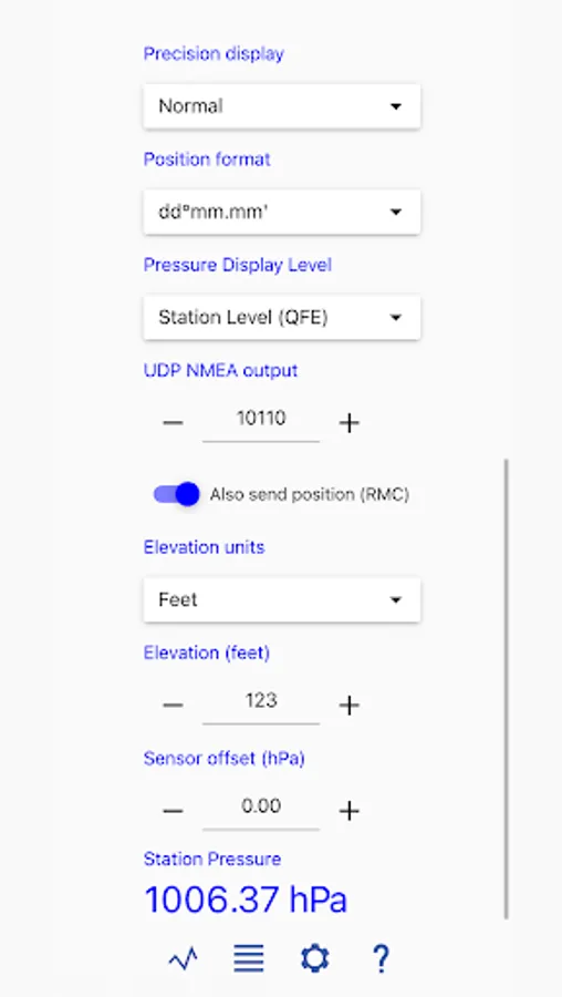 The app will also share wirelessly both pressure and position information with nearby devices. The data are broadcasted from the app via WIFI in UDP mode on a user selected port, so that the app can serve as a position source or pressure source for other navigation programs or devices, which makes it an excellent back-up to standard electronic charting systems.