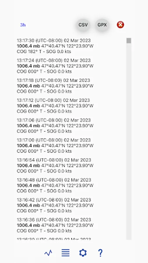 The stored data can be viewed from within the app or exported and shared according to time range of the storage files. The stored data are effectively a log of the voyage (or land travel) with navigation information as well as pressure data. Besides the pressure data, your track of GPS positions can also be exported as a GPX file to view in a navigation program or Google Earth.