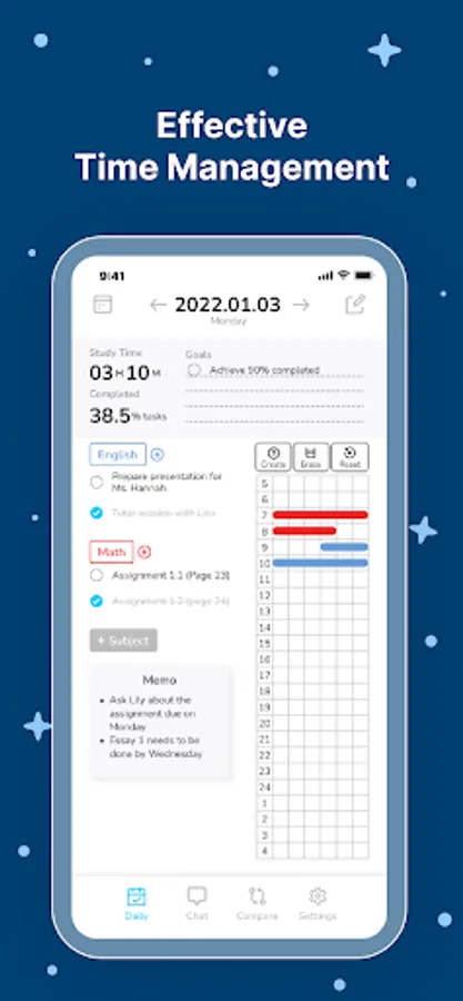 【Effective Time management】We, Star Planner, give you constant access to our timetable function, we focus on helping users take up the most suitable and effective time management, to achieve this, we provide you with the template timetable from our coaches, and you can schedule your timetable and compare it with the suggested schedule, and our coaches will help you to customize your timetable, coaches will also have regular communication with you to check the efficiency of the timetable and adjust if needed. With our timetable, you can set targets and record the completion ratio of a specific time slot. With our function, you can maximize your time, then increase productivity and become highly efficient.