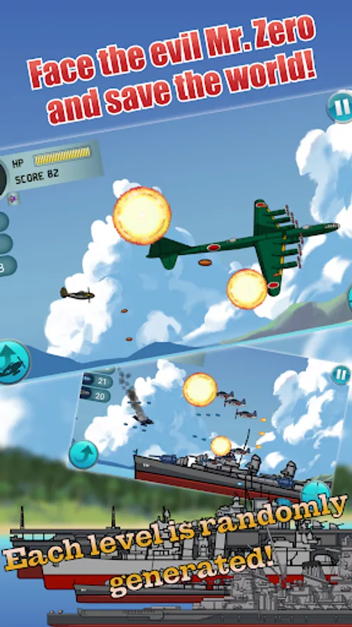 A fierce war has engulfed the Ocean. As Mr. Zero, an evil military industry conglomerate owner, tries to take over the world, it is up to you take the position of a pilot in the International Liberation Army. In this alternative universe, you will have the chance to fly different historical fighter planes in your effort to free the world from Mr. Zero's grasp. Become an ace pilot and take down hordes of enemy fighter planes and bombers, sink huge ships and lead your fleet to victory!
