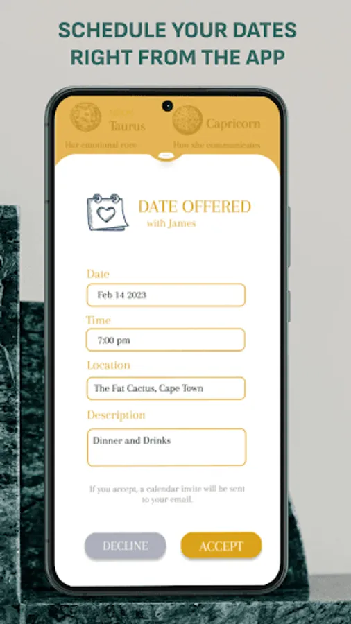 - Remember the “date” part of online dating? If you’re ready to meet up in person on a date, you can schedule your date with your match right from the app. Date appointments are automatically sent to your calendar.