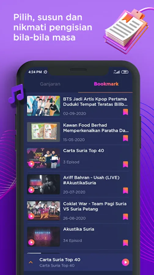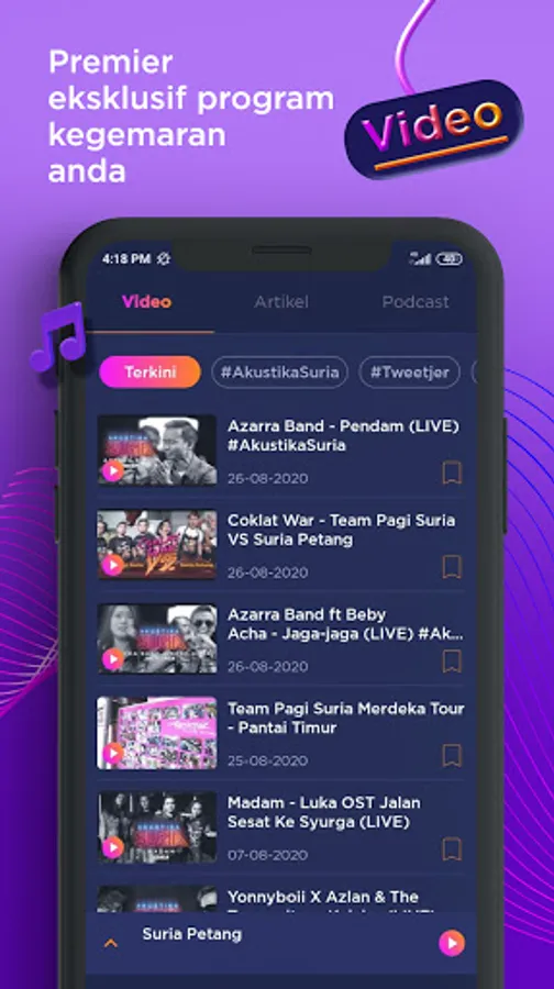 Enjoy live broadcast streams, playback of your favourite shows of the week and the latest updates on Suria original content via Video and Podcast.