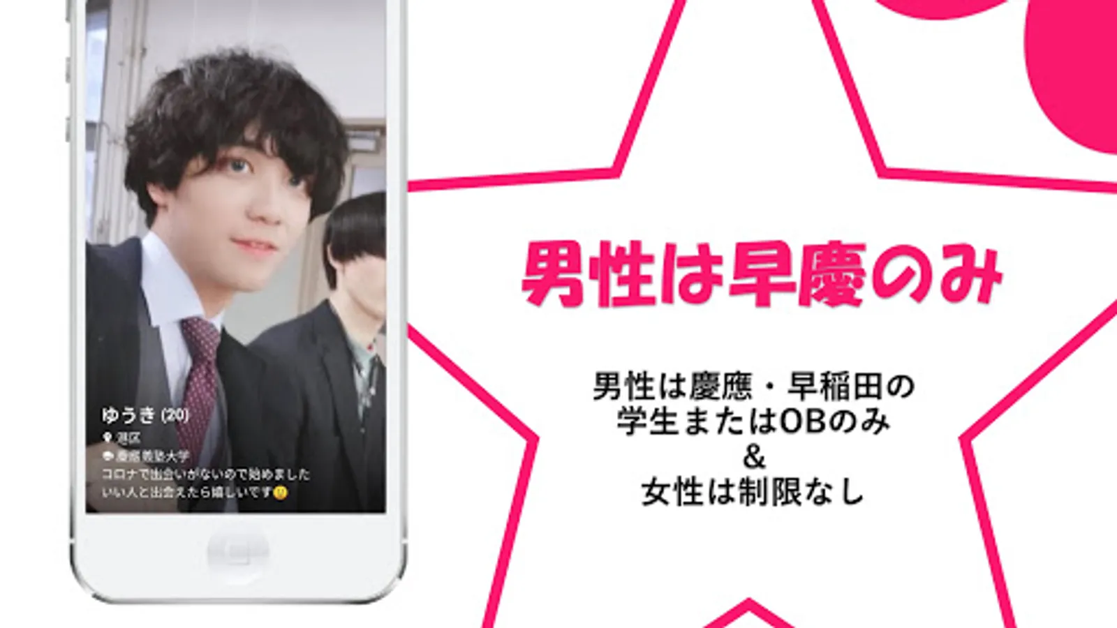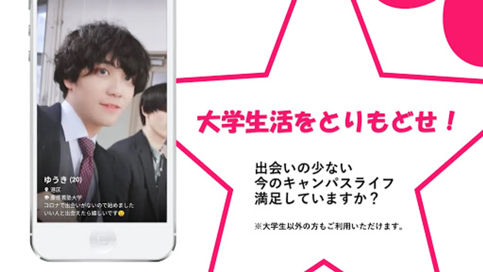 "Keioboys" is an intercollegiate matching app that helps you find love, marriage, and friends. Messages are available free of charge. *Paid plans available For men, only current students and alumni of Keio University, Waseda University, Sophia University, Gakushuin University, Meiji University, Aoyama Gakuin University, Chuo University, and Hosei University are users. (Possibility of expansion to other universities in the future)