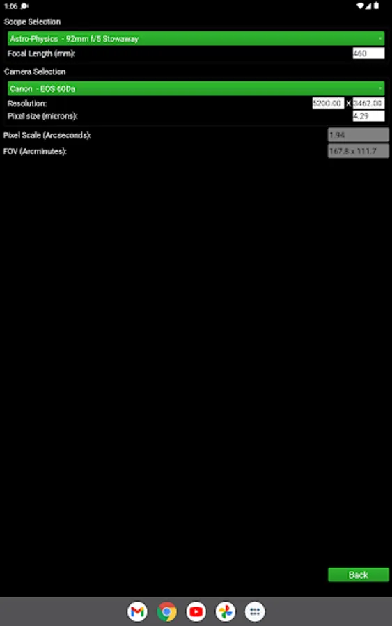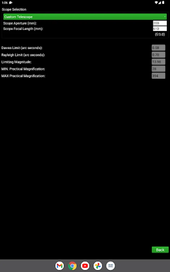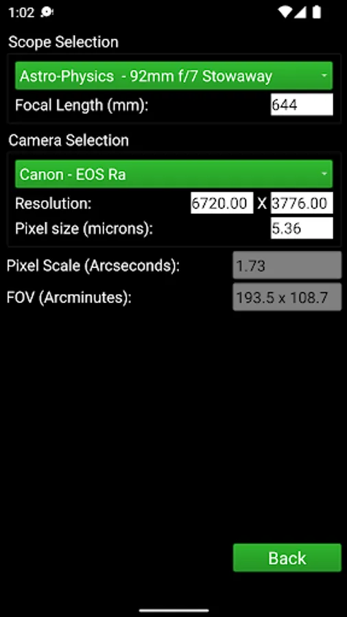 There are numerous formulas for computing the specifics of your telescope, eyepieces, and camera's characteristics when used together. ScopeWizard brings those formulas together in one handy place. An included database of telescopes, eyepieces, and cameras can be used to mix and match your equipment, or you can enter custom values manually.