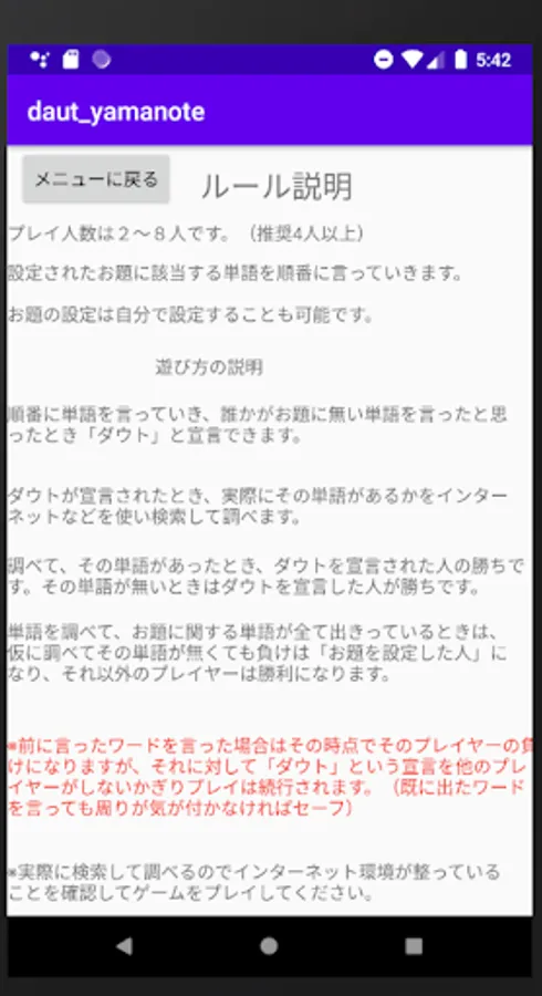 山手線ゲームのルールに従って決められたお題に沿ったワードを順番に言っていきます。仮に、お題にそぐわないワードを言ったなと思ったタイミングでプレイヤーはダウトと宣言します。実際にインターネットでそのワードを検索してお題にそぐわないワードだったらダウトを宣言したプレイヤーの勝利。お題に合う内容をダウトしてしまった場合はダウトを宣言されたプレイヤーが勝利となります。