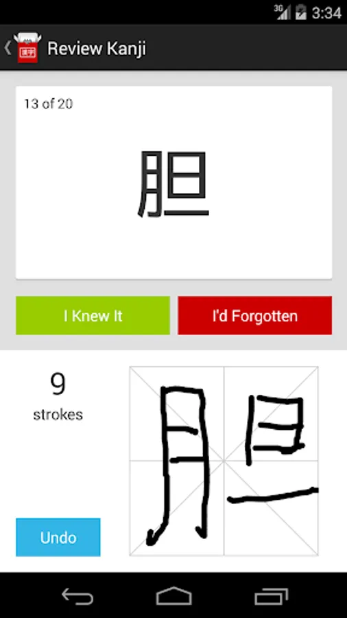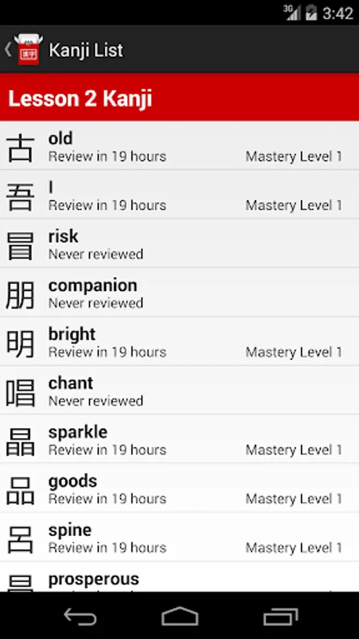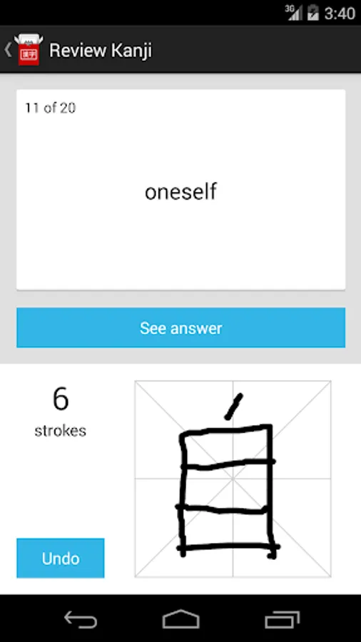 To use the app, first select the last lesson you've read in the book. Afterward, you can review kanji flash cards. When reviewing, the app will show you the keyword associated with the kanji, and prompt you to attempt to draw the correct kanji yourself. After you've drawn it, you can flip the card, and then tell the app if you got it correctly. The more times you answer correctly, the less often that kanji will appear in the reviews.