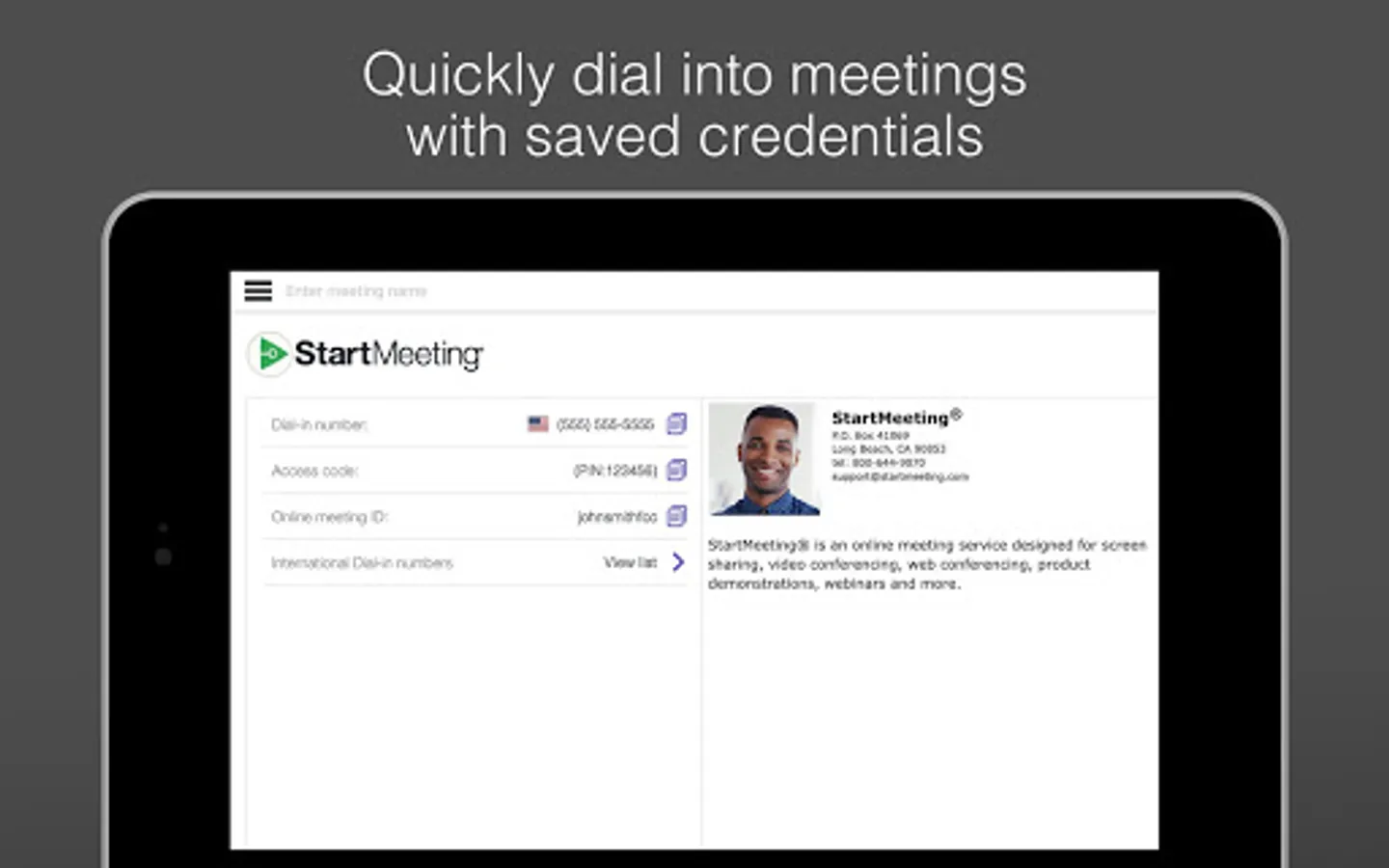 To get started, download the app to your device. At the scheduled time of the online meeting, tap the invitation link from your email or the StartMeeting app and enter the meeting credentials.