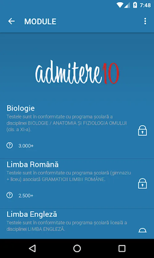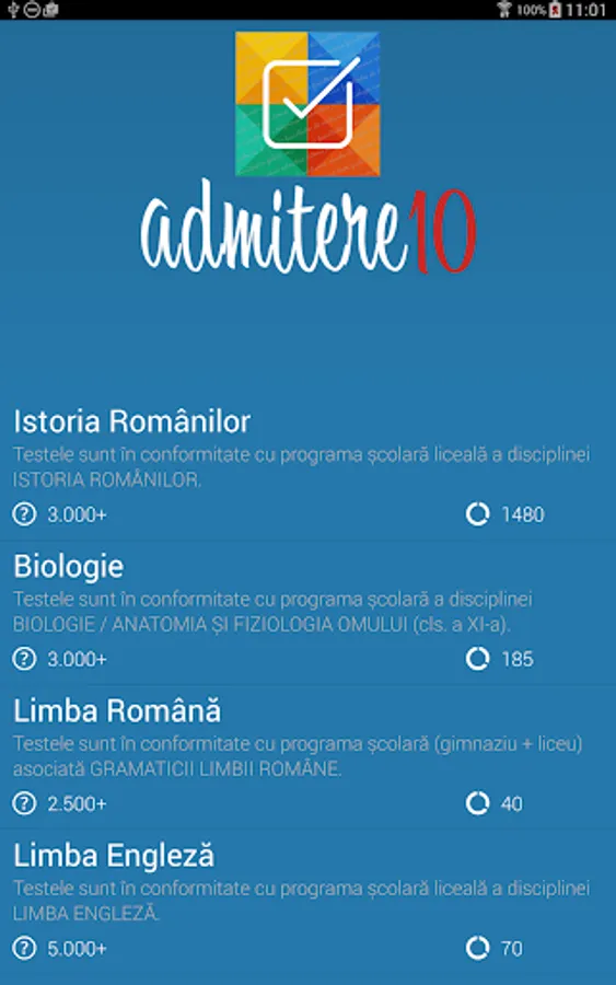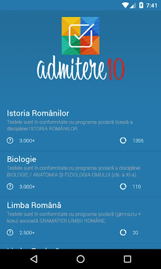 Pe scurt, aplicatia Admitere10 cuprinde un număr important de teste în conformitate cu tipul de întrebări grilă date la examenele din anii anteriori, după cum urmează: