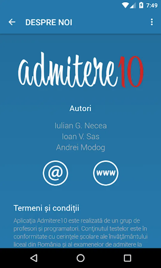 Aplicația Admitere10 este realizată de un grup de profesori și programatori. Conținutul testelor este în conformitate cu cerințele școlare ale învățământului liceal din România și al examenelor de admitere la Facultăți de profil (Medicină, Poliție, Drept, Limbi străine).