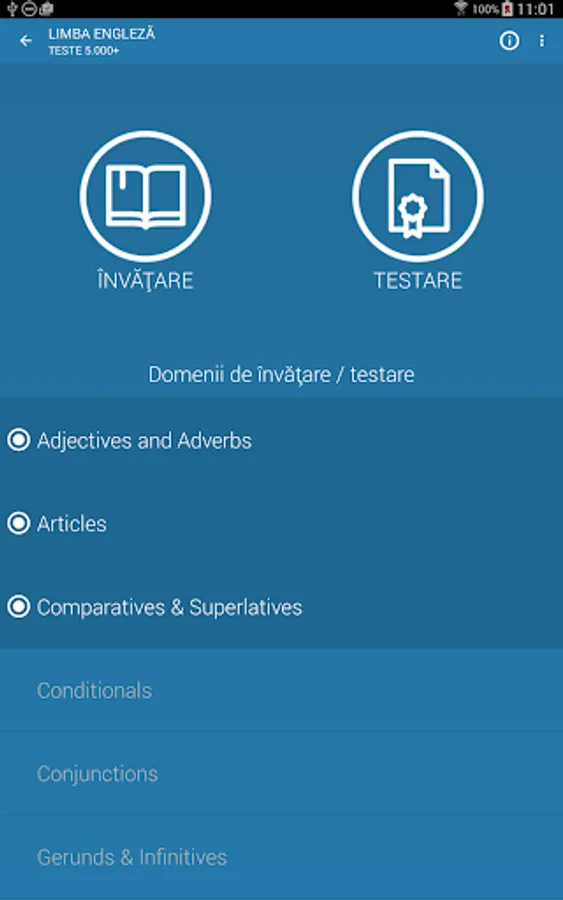 - Limba Engleză: 15 domenii, 5.000+ întrebări