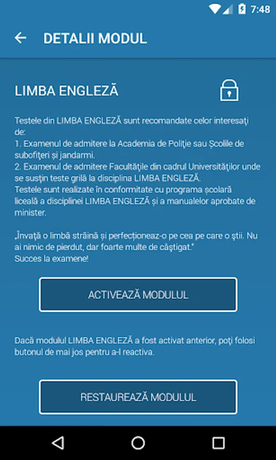 Aplicația folosește codul IMEI si emailul contului Google asociat pentru a putea identifica utilizatorii care au cumpărat diferite module și pentru securizarea conținutului. Aplicația nu face apeluri și nu accesează lista de contacte sau alte informații personale.