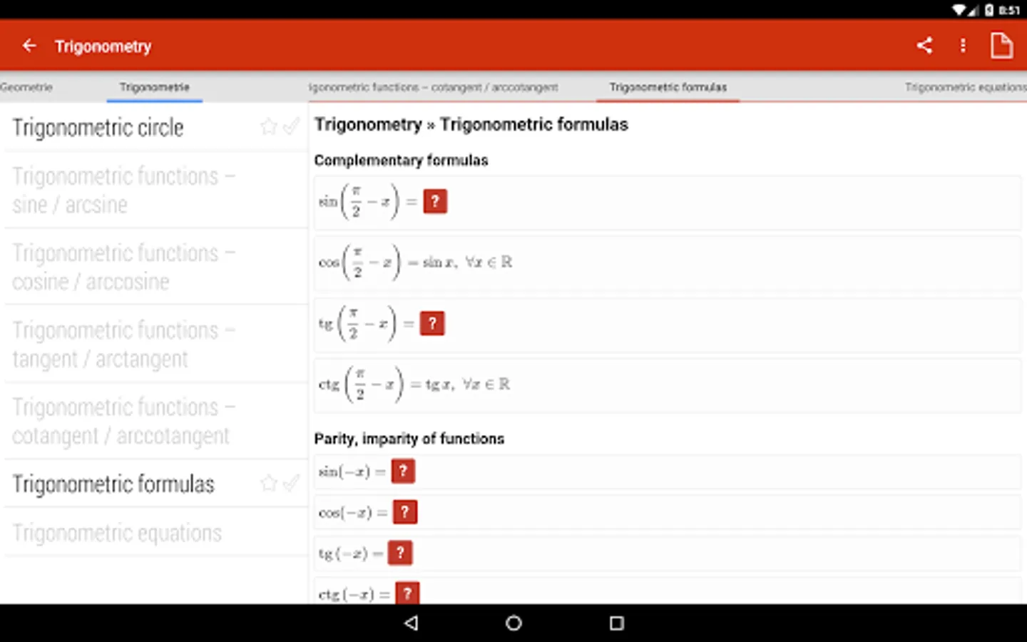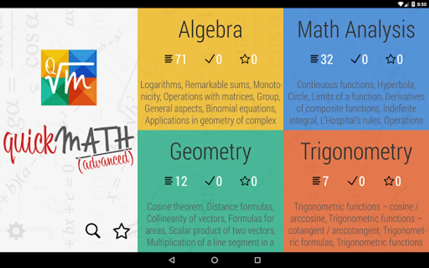 QuickMath is designed to students and teachers and offers the possibility to learn and memorize the most common Math formulas, theorems, definitions, and properties. Graphics, algorithms and examples complete the QuickMath offer. It can be downloaded and installed on any device. After download and install the lessons content need to be updated to the last version.