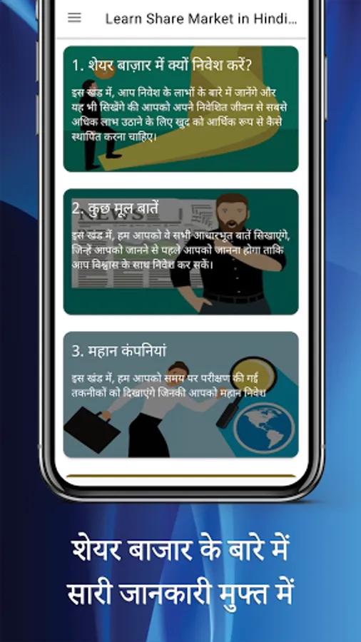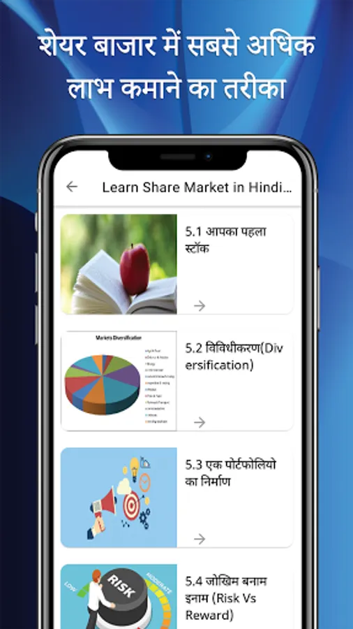 There are no quizzes or spreadsheets, just small lessons of original Hindi content. And these lessons are designed to teach you the fundamental principles of investing in the Share Market.