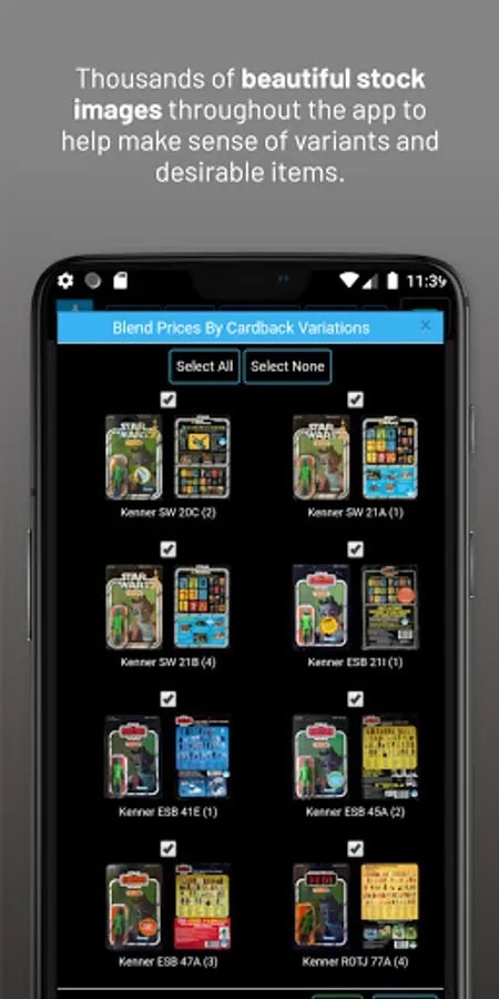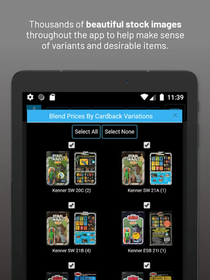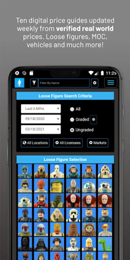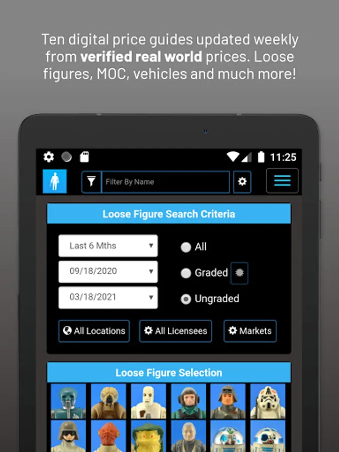 The actively maintained digital price guides allow you a unique view of the market. Enriched prices are harvested weekly from various collector markets, and cover hundreds of items such as loose figures, mint on card figures (MOC), vehicles, playsets, POTF coins and much more!
