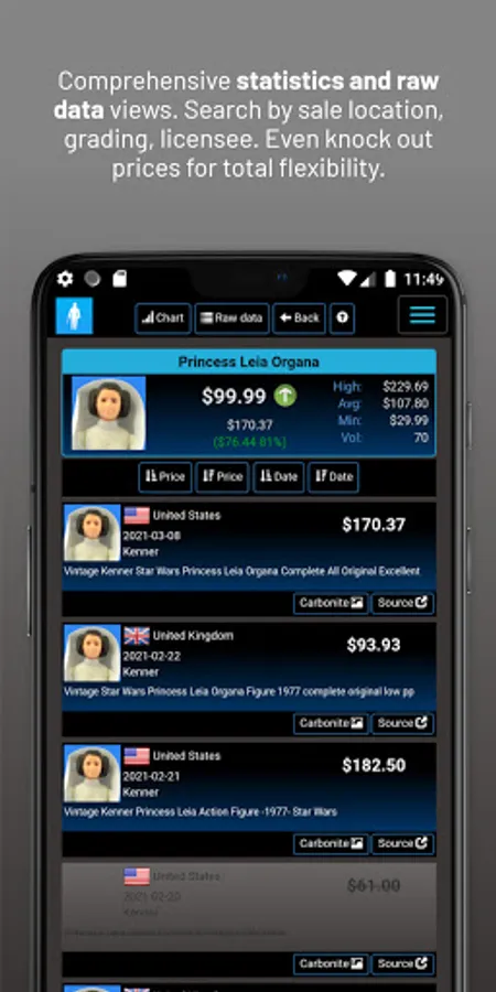 * Enriched statistics, percentile bands, and scatter graphs along with raw data allow you to analyse prices in powerful ways. Never over-pay and never under-sell!