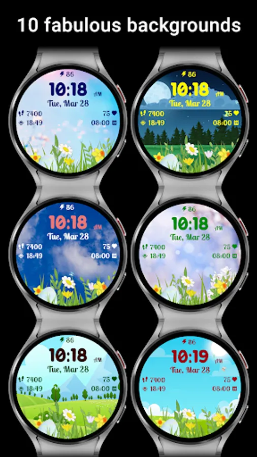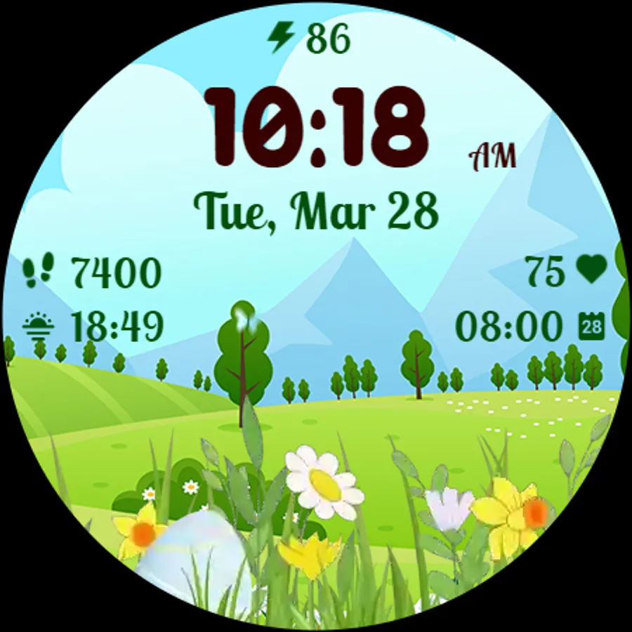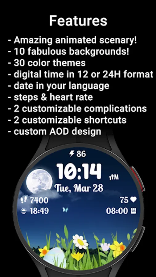 Our watchface features a cute bunny, hiding around amidst windblown flowers and fluttering butterflies, creating a delightful and enchanting ambiance. With 10 different backgrounds to choose from, you can customize your watchface to suit your mood and style.