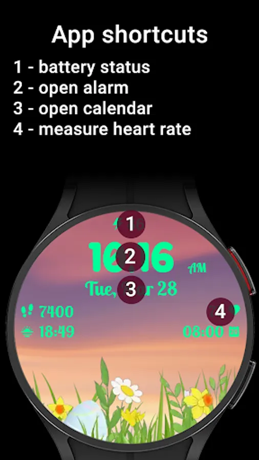 Customize the watchface as you wish: choose the background you like the most, choose the best looking color theme for time, date and stats, choose the animated scenery or the static scenery to save battery, select the data you want for the 2 customizable complications, select your desired apps to launch using the 2 customizable shortcuts and enjoy using the watchface! Check the screenshots from the store listing to better understand where the shortcuts are placed.