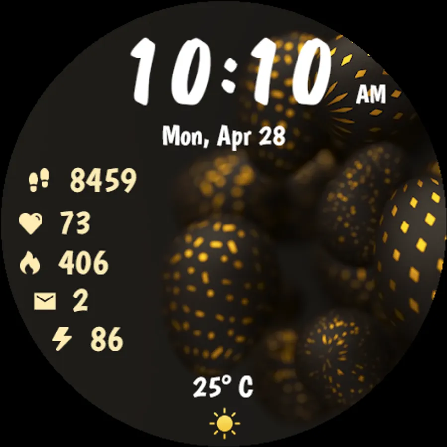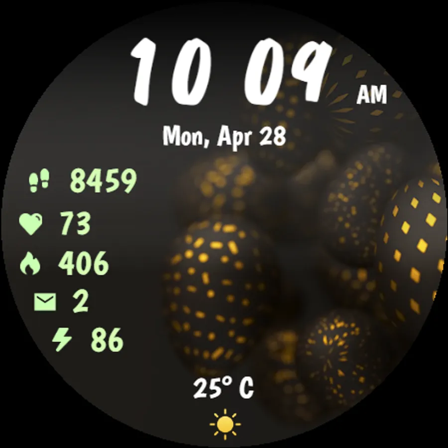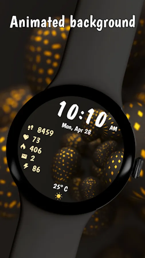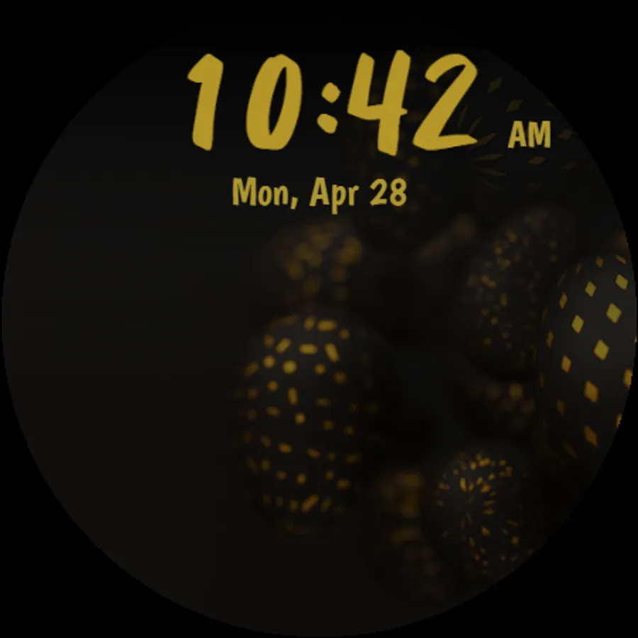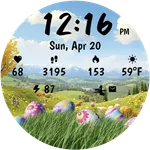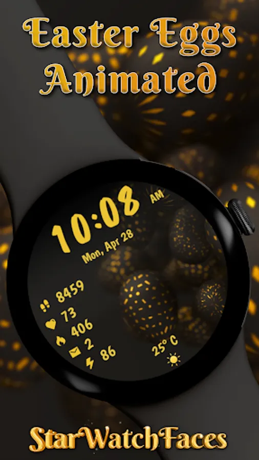 Enjoy a playful yet luxurious animated background filled with rotating 3D-style Easter eggs wrapped in glowing gold patterns. The animation adds depth and character without draining your battery, making this watchface as functional as it is gorgeous.