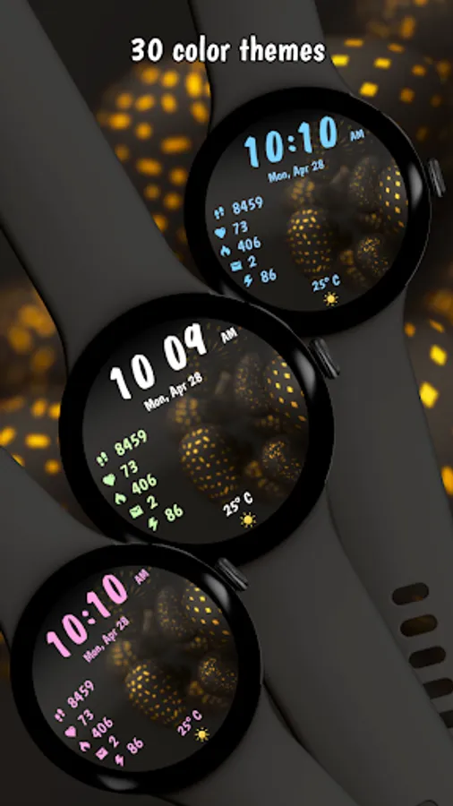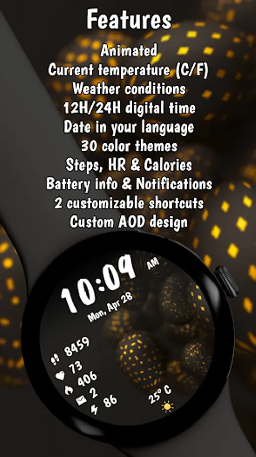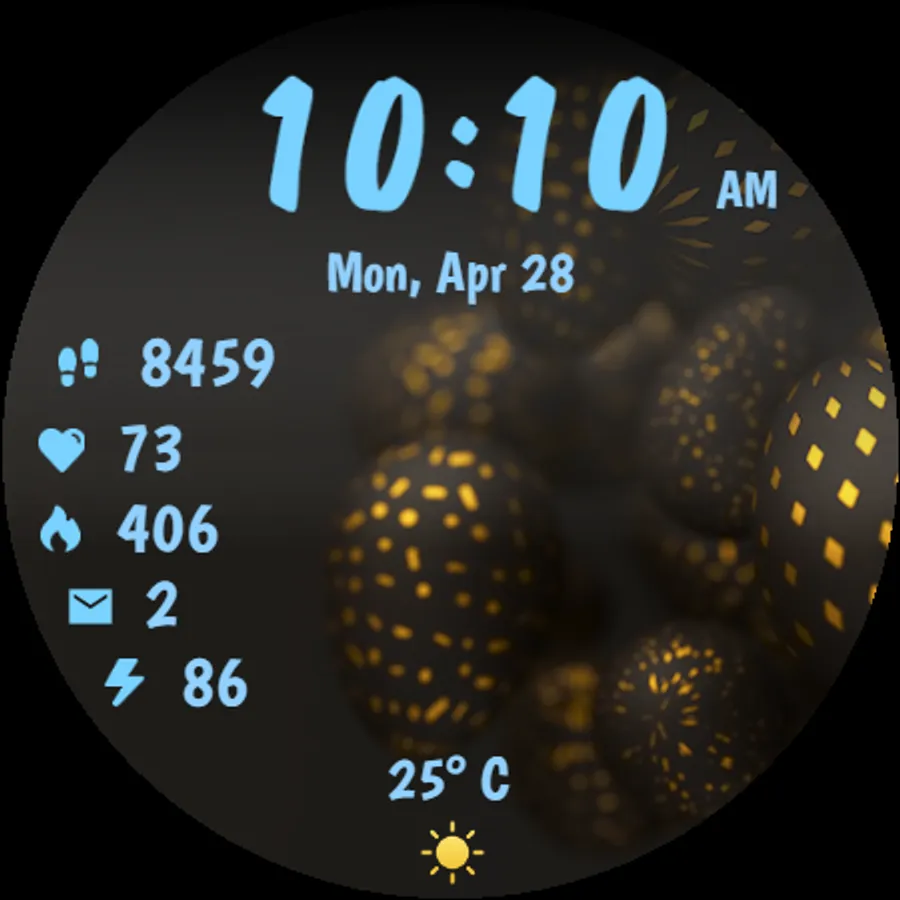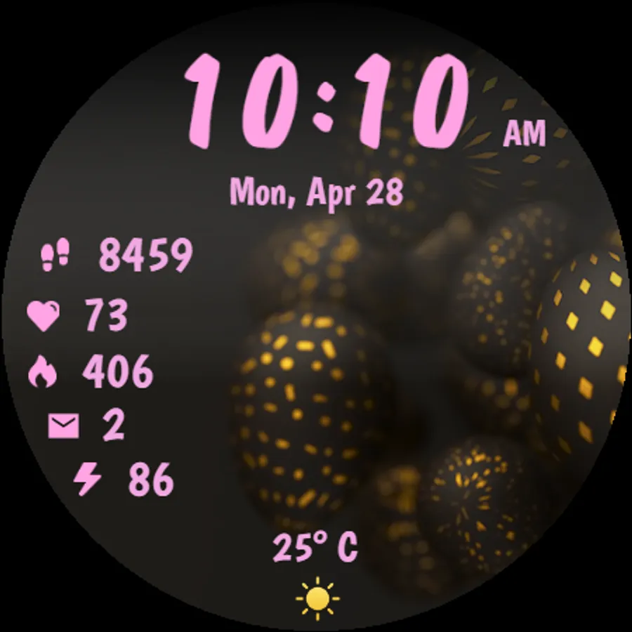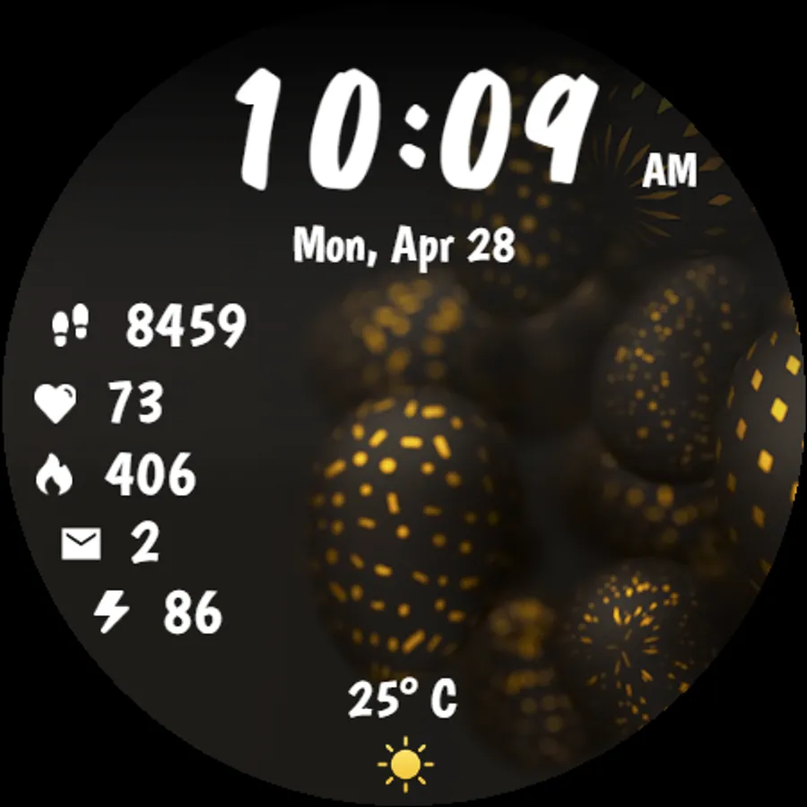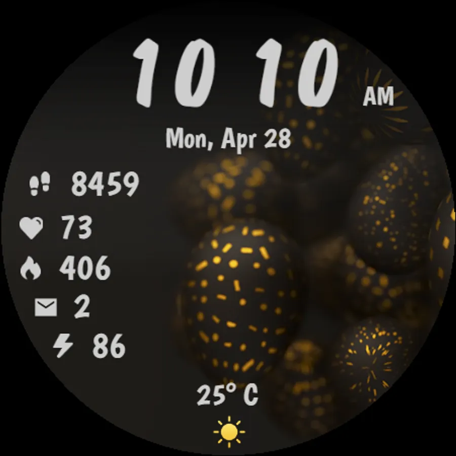 Enjoy a playful yet luxurious animated background filled with rotating 3D-style Easter eggs wrapped in glowing gold patterns. The animation adds depth and character without draining your battery, making this watchface as functional as it is gorgeous.