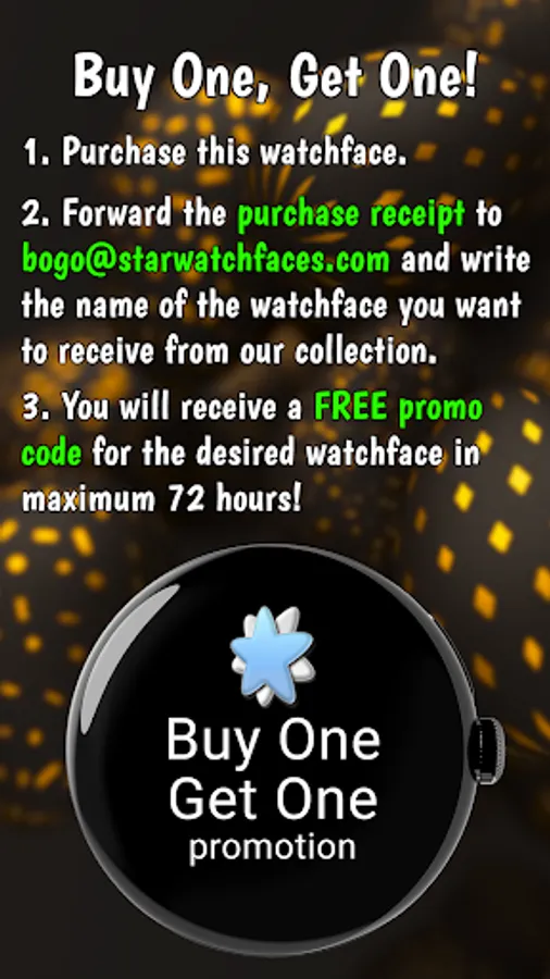 Purchase the watchface, then send us the purchase receipt to bogo@starwatchfaces.com and tell us the name of the watchface you wish to receive from our collection. You will receive a FREE coupon code in 72 hours maximum.