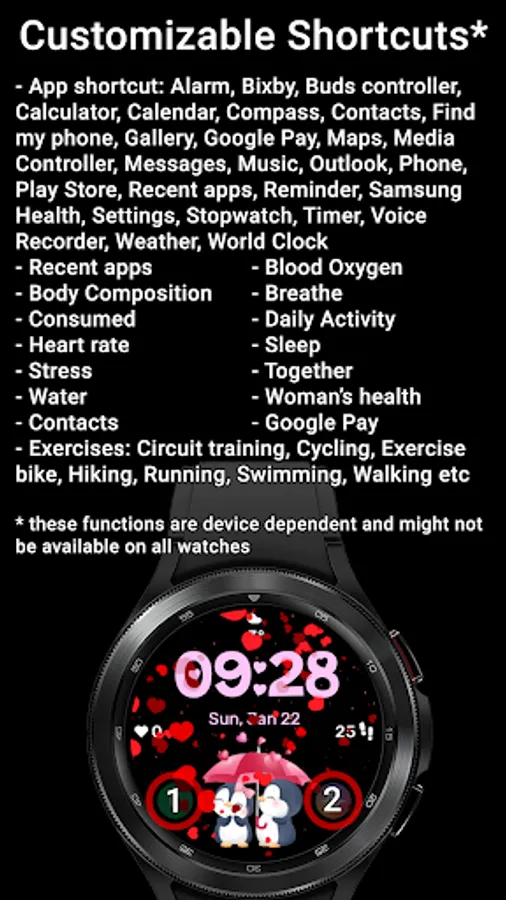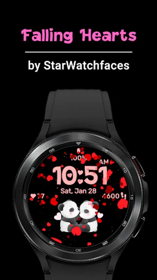 This beautifully animated Valentine's Day watchface is the perfect addition to your smartwatch. With falling hearts and a wide selection of 10 adorable and charming characters to choose from and 25 color themes for time, date and stats, you'll be able to find the perfect match for your personal style, making your watchface truly unique.