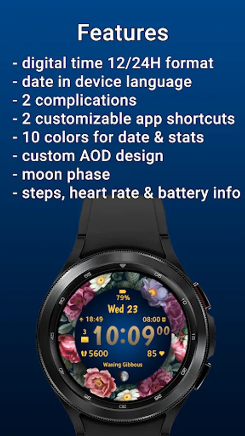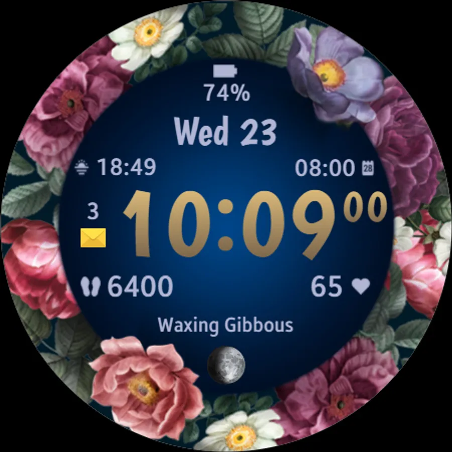 The digital clock is displayed in either 12 or 24H format, with a custom font in a gorgeous golden color. The date is displayed in your device's language, making it easy for you to stay on top of your schedule. Keep track of your heart rate, steps, and battery information, all at a glance. And with the moon phase feature, you can keep track of the lunar cycle and stay connected to the natural world.