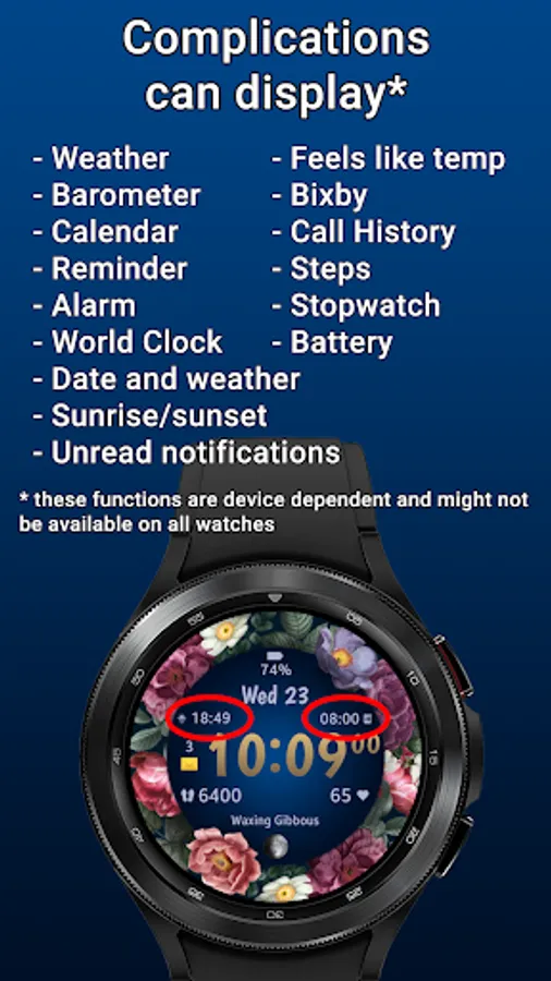 Please keep in mind that the stats that the complication can display and the apps that can be launched from the shortcuts are device dependent and might not be available on all watches or they might vary from watch to watch.