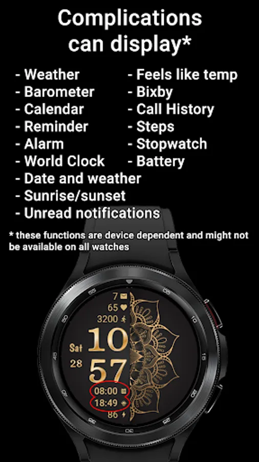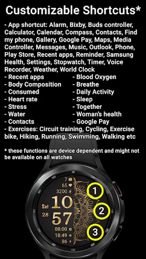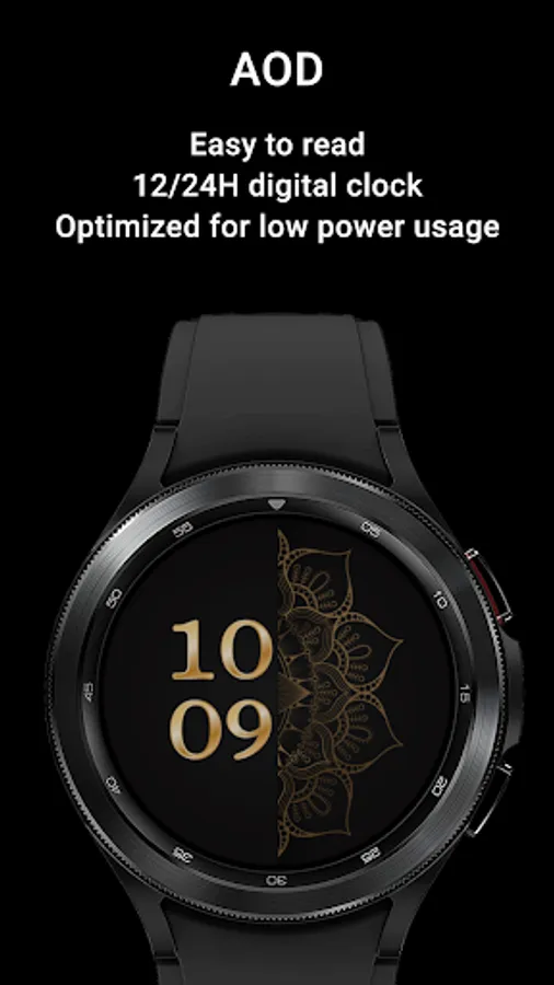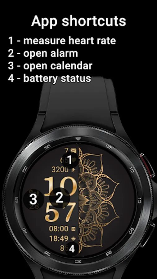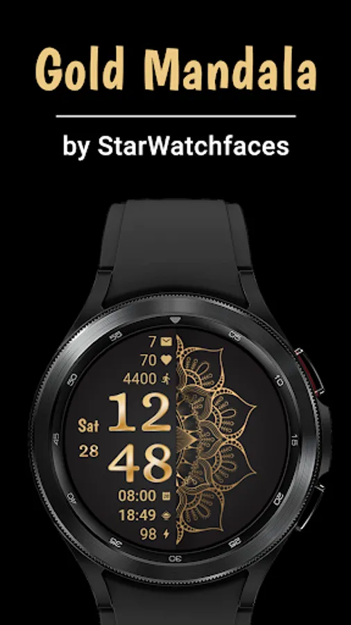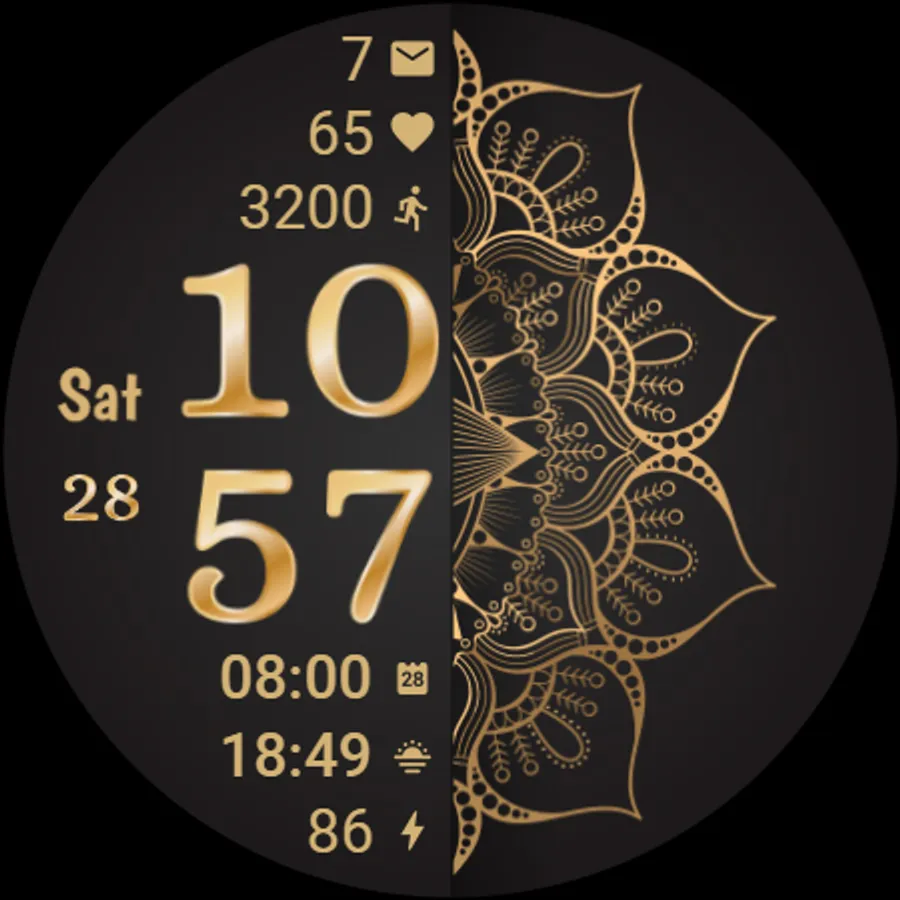Introducing Gold Mandala - the ultimate luxurious and elegant watchface for you. This stunning watchface features a beautiful golden mandala design, paired with digital time displayed in elegant golden numbers. But it's not just a pretty face - Gold Mandala also provides useful stats like steps, notifications, heart rate, and battery information, as well as two complications that can display any data you wish and three customizable shortcuts to make your life easier and help you quickly launch your favorite apps. Whether you're dressing up for a night out or just want to add a touch of glamour to your daily routine, Gold Mandala is the perfect choice. So why wait? Treat yourself to the luxury and sophistication of Gold Mandala today!