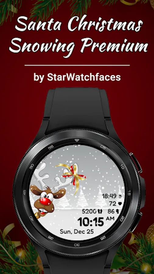 Enjoy the cutest watchface for this Christmas, with realistic animated snow, 36 background images, 20 colors for clock, date and stats, 2 customizable complications, 3 customizable shortcuts at the top, digital clock in 12 or 24H format, date in device language and custom designed AOD.