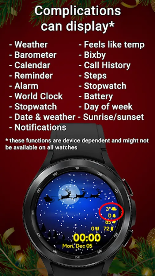 Santa Christmas Snowing Premium is the best watchface to wear this season for your Galaxy Watch or any other Wear OS based watch. Customize it as you wish: choose the funniest background image, choose the best looking color for time, date and stats, select the data you want for the complication, select your desired apps to launch using the top 3 shortcuts and enjoy using the watchface!