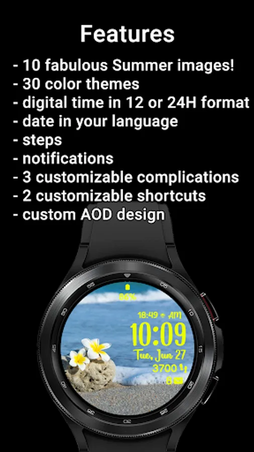 So don't wait - upgrade your watch today with this amazing Summer themed watchface, and experience the perfect combination of fashion and function. With its advanced health data features, customizable complications, and gorgeous Summer backgrounds, this watchface is sure to become your new favorite accessory!