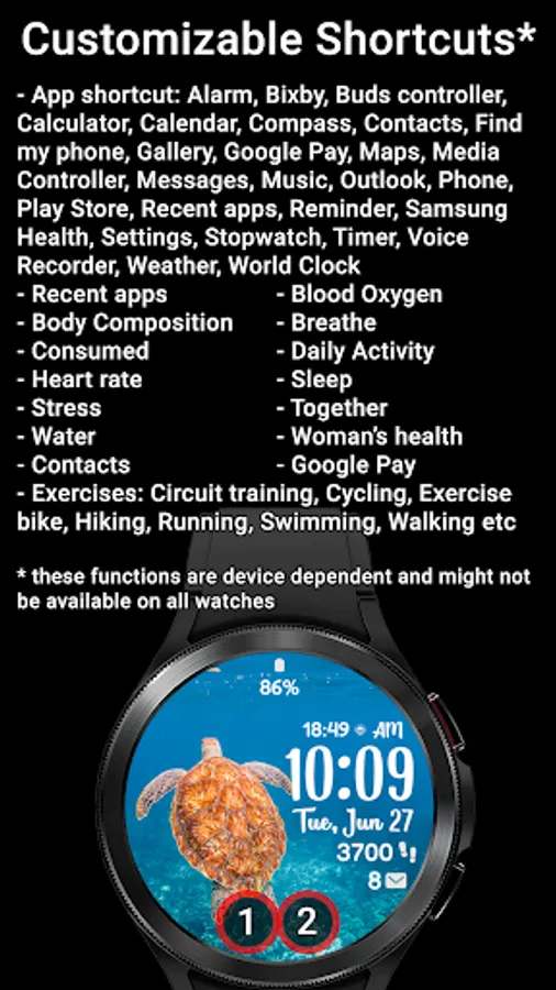 But this watchface isn't just about looks - it's also packed with advanced health data features to help you keep track of your fitness goals. With 3 customizable complications and 2 default complications, you can easily access important health data such as your steps, right from your wrist and further customized the health data shown. And with 2 customizable shortcuts, you can quickly launch your favorite health and fitness apps, making it easier than ever to stay on top of your wellness routine.