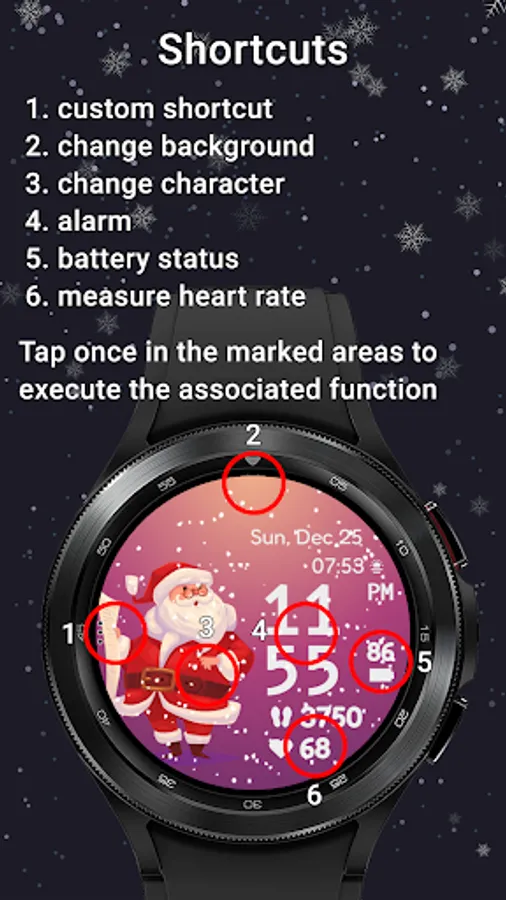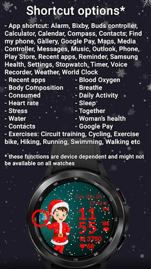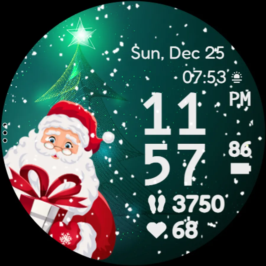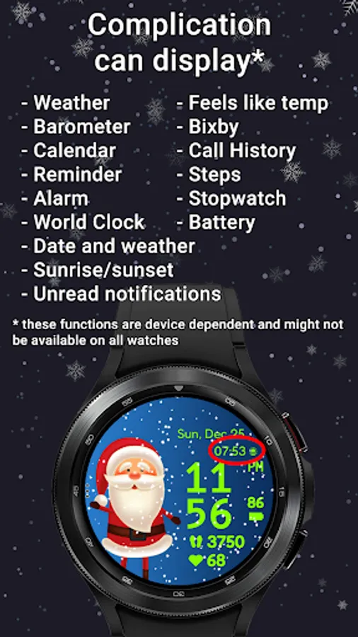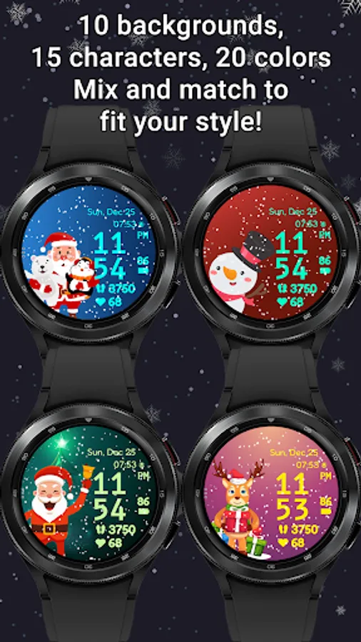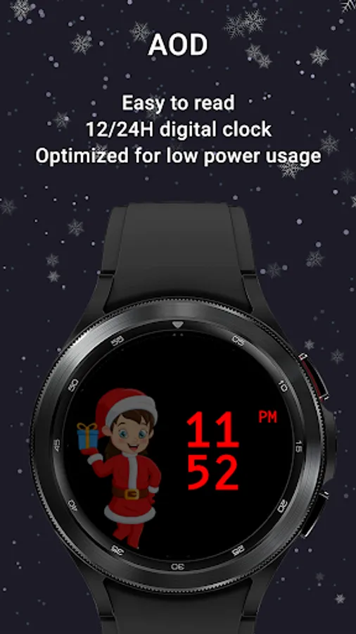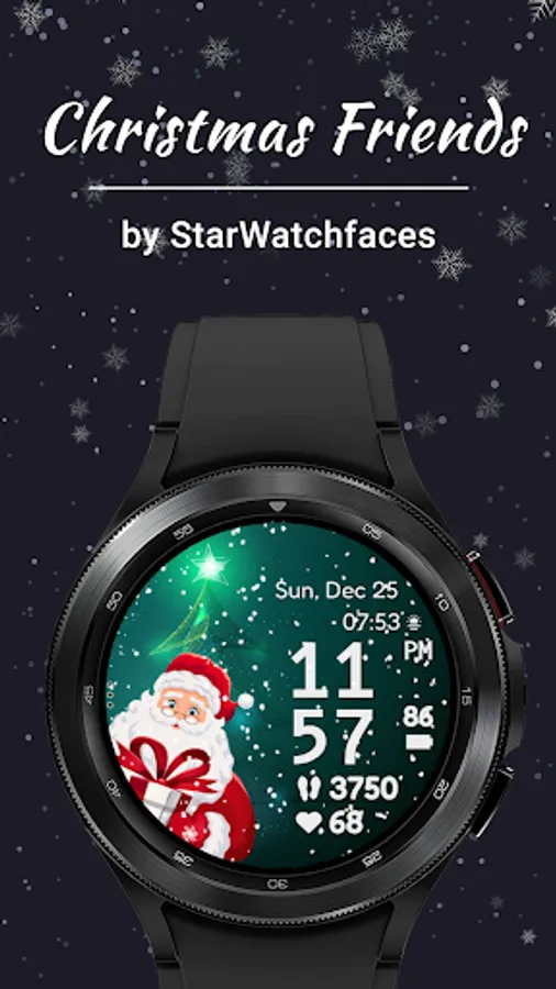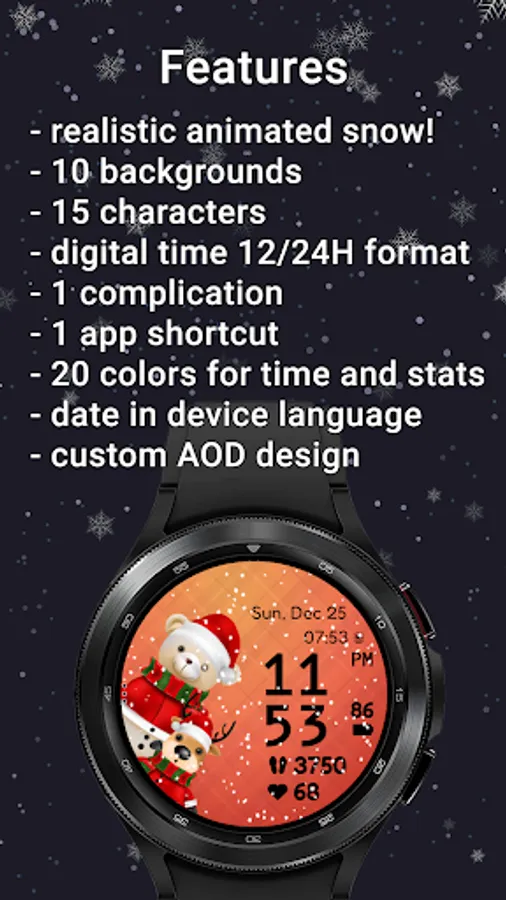 Have Santa and his friends on your wrist. With realistic animated snow, 10 different backgrounds, 15 characters, 20 colors for clock, date and stats, a customizable complication and a customizable app shortcut, digital clock in 12 or 24H format, date in device language and custom designed AOD, Christmas Friends is the cutest watchface to wear this season for your Galaxy Watch or any other WearOS based watch.