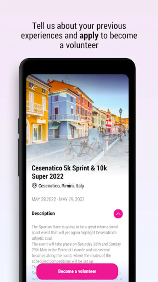 Want to experience the adrenaline rush of being part of a sporting event, but not as an athlete? Participate as a volunteer! You will feel part of the organizational machine, trying a new experience. In just one App you will have the calendar - with all the events you can sign up as a volunteer - your agenda - with all the information of the day - your badge - to check in and report your presence - and the chat - to contact immediately your area manager, without needing his phone number!